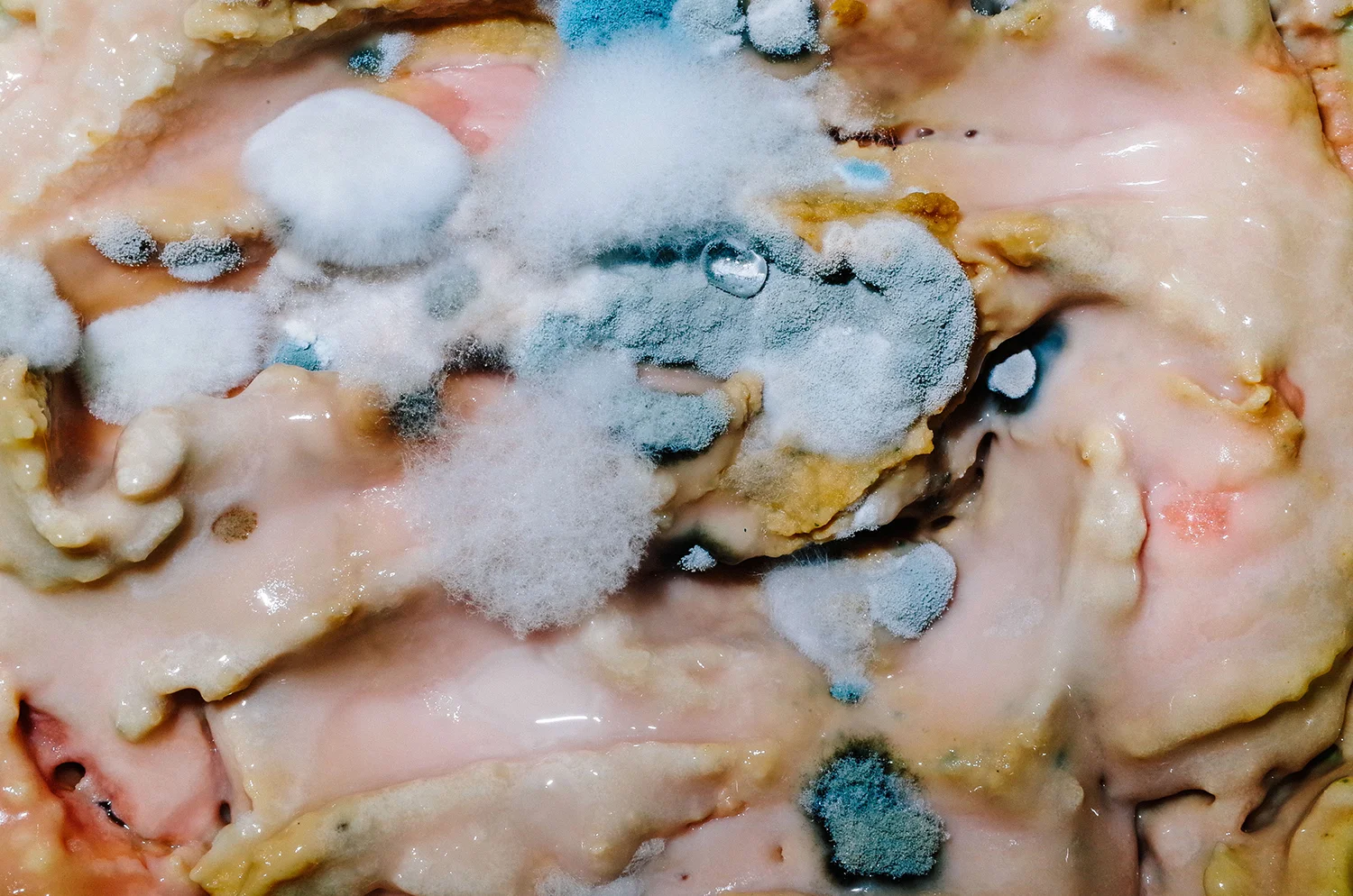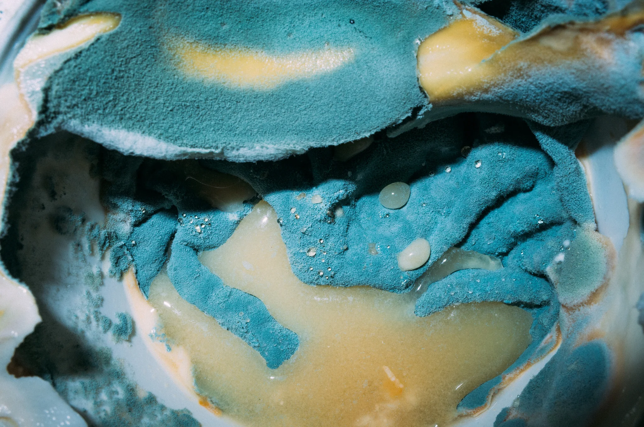 Does your work reflect on the medium of photography or the photographic image? If so, is that intentional? Many people are disgusted by our photographs, but they seem to forget the difference between the real mold growing in the fridge, an image of it and the 2D object which shows particular colors and forms. However some of the viewers manage to stop thinking of the mold itself but start to consider the pictures as what they are. It feels like a little confirmation for us, that we are moving in the right direction. It is exciting to imagine that a picture of mold can hang on the wall at a prestigious location while the mold itself disgusts everybody and will usually be thrown away asap.