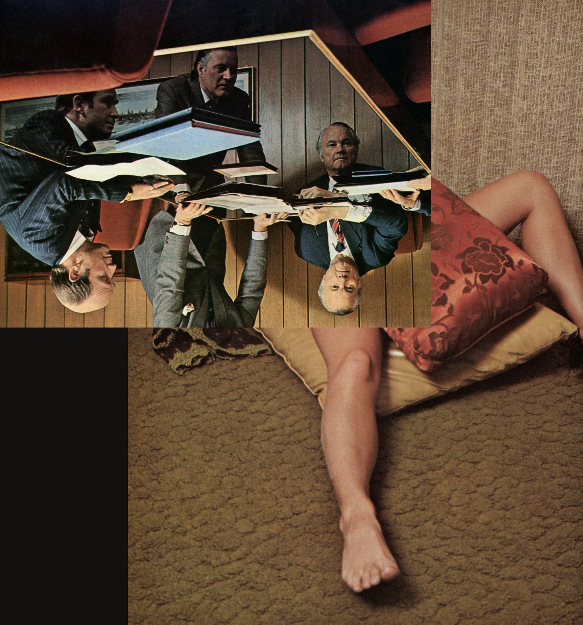 My work has a sculptural quality, based on the cutting of two dimensional imagery. Collage is an inherently spatial/sculptural practice. I have also made work in which core elements of found photographic pictures are used to make tactile, tangible objects - crossing the divide from a two dimensional picture to physical space. An example is my work Split. It started with a found photograph, a pin-up picture depicting a woman on a bed. I then made a new version of the flowery pattern on the bed, printed it as a cotton fabric and used it to reupholster an actual chair, which is then placed in front of the photograph. In a sense the photograph comes out into the real world. The viewer is invited to sit on the chair, and in this way the viewer becomes enveloped by the photograph itself. I consider many of my works as objects from the start - scale and positioning of works within space, for example a gallery, a billboard or a home, is part of the planning when making a work. Some works turn out to be more maleable, and can take on several different forms. Endurance is not my main concern, not everything is made to last.
